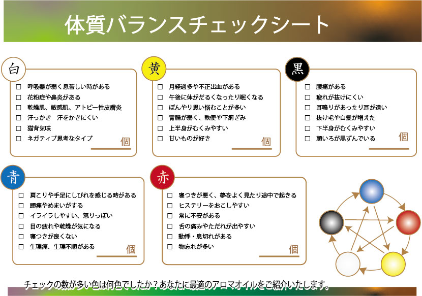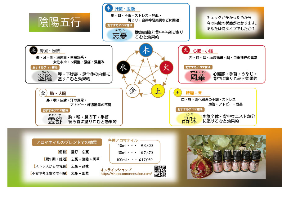 漢方アロマとは、中国の中医学理論と西洋のアロマセラピーの概念とを融合し、最新の科学技術によって開発された精油です。 中国には古代から、「木は火を生じ、火は土を生じ、土は金を生じ、金は水を生じ、水は木を生ず」という相互の関係性を示した自然哲学「五行思想」がありますが、これは人間の体の五臓六腑にもあてはまり、木=肝臓・胆嚢、火=心臓・小腸、土=膵臓・脾臓・胃、金=肺・大腸、水=腎臓・膀胱として、互いに影響し合っているといわれています。 この考え方を軸に経絡道での今の貴方の状態を診断し、東洋医学からの観点で心と身体の不調の原因を紐解き、根本的ケアをアドバイスいたします。